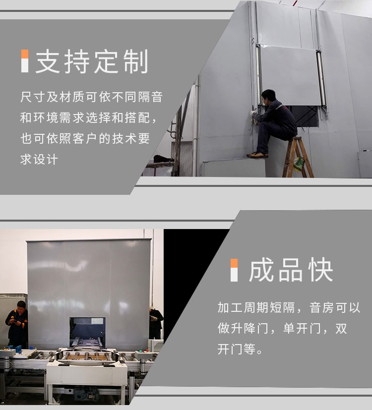 5、靜音房成品收集面可設計設置升降門,采用輕型材料制作,采用電機驅動、機械傳動升降,升降動作連鎖保護,并設置安全保護裝置和聲光報警器,確保操作人員的安全;